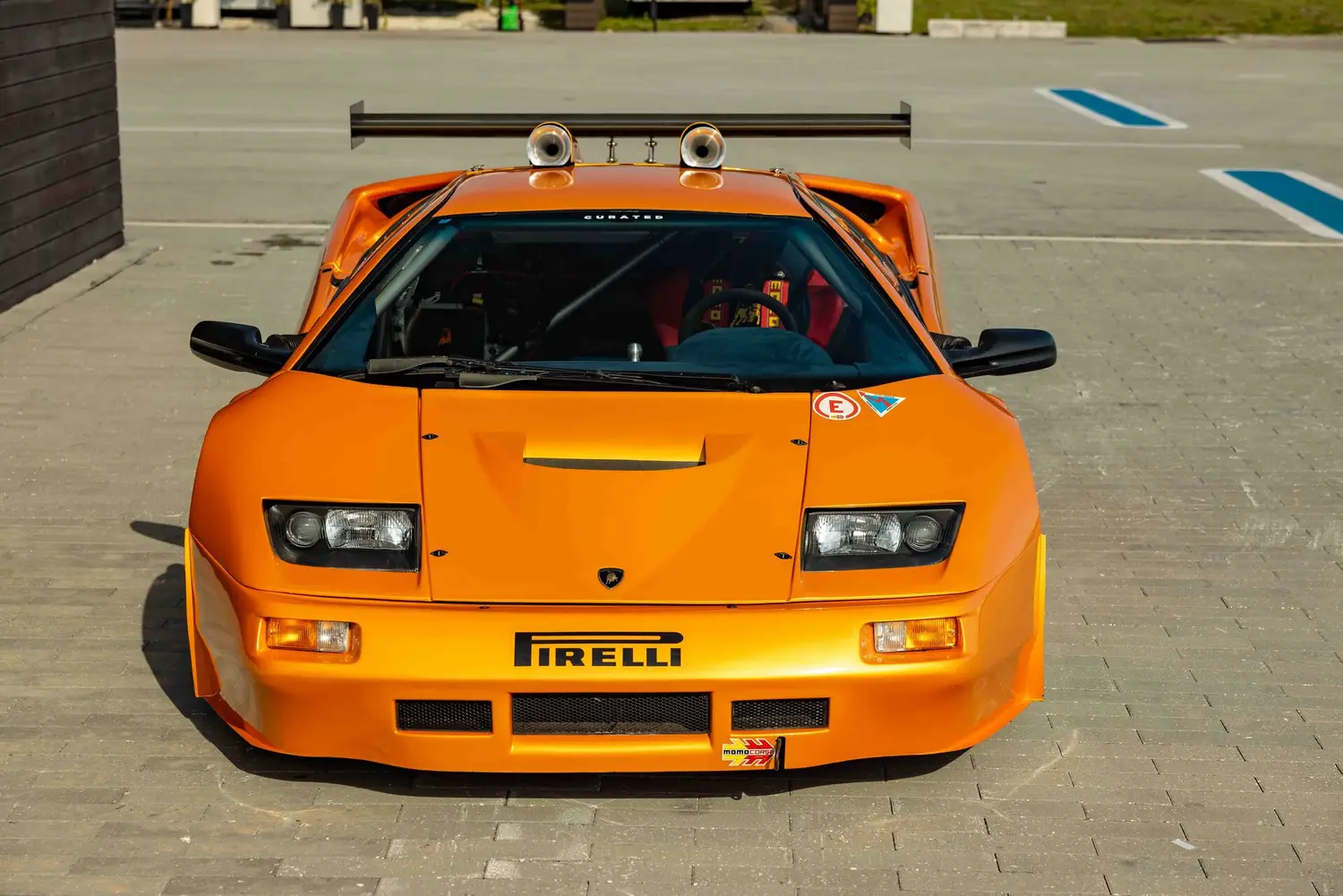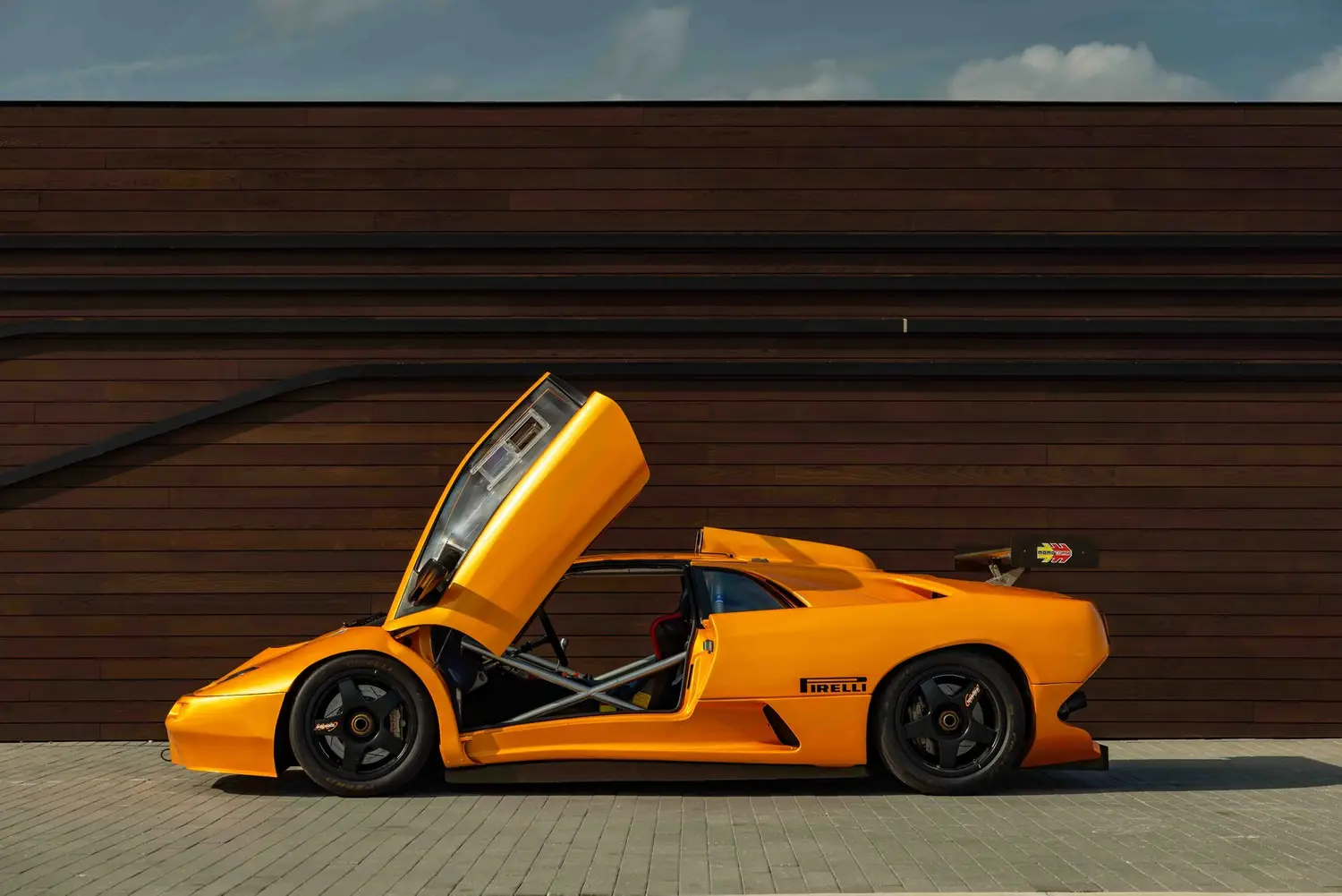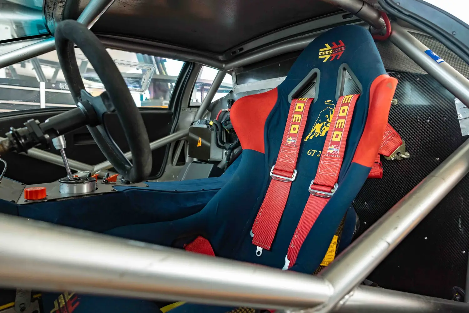 The GT2's body was crafted from carbon fiber reinforced over a full racing chassis, designed alongside the road-going version. It served as a test platform for new aerodynamic and engine technologies on major international race tracks and was not intended for private sale. The GT2's appearance closely resembled the Diablo SV-R and Swiss-built Affolter-based cars, featuring Plexiglas side windows with small sliding sections, a full roll cage, and a single racing seat with a multi-point harness.