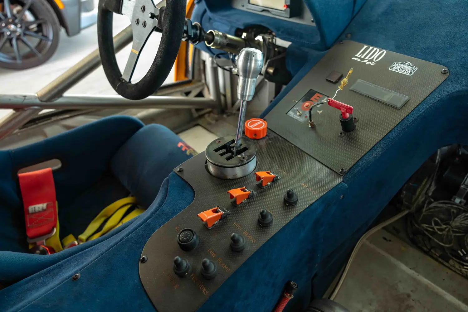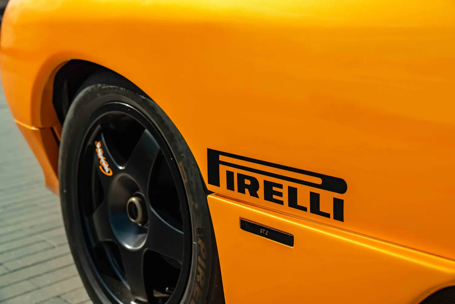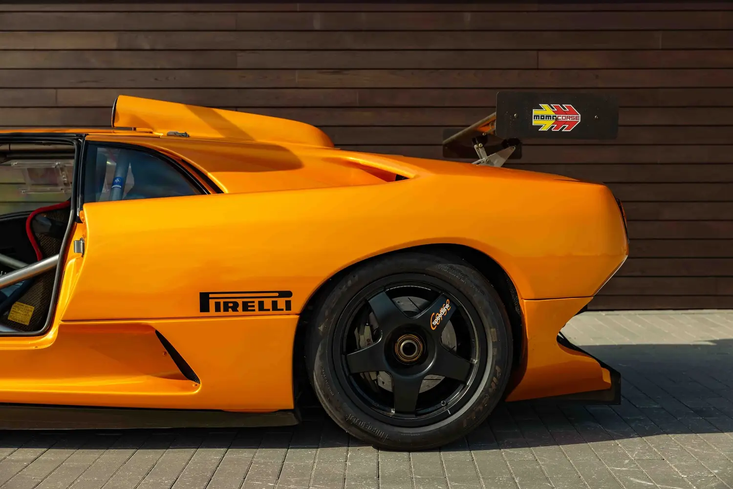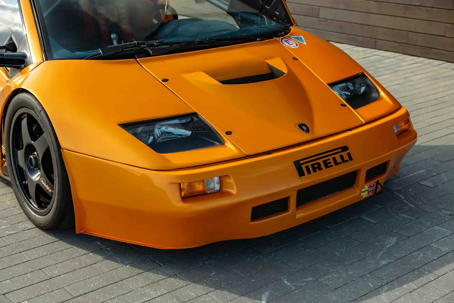 The GT2's body was crafted from carbon fiber reinforced over a full racing chassis, designed alongside the road-going version. It served as a test platform for new aerodynamic and engine technologies on major international race tracks and was not intended for private sale. The GT2's appearance closely resembled the Diablo SV-R and Swiss-built Affolter-based cars, featuring Plexiglas side windows with small sliding sections, a full roll cage, and a single racing seat with a multi-point harness.