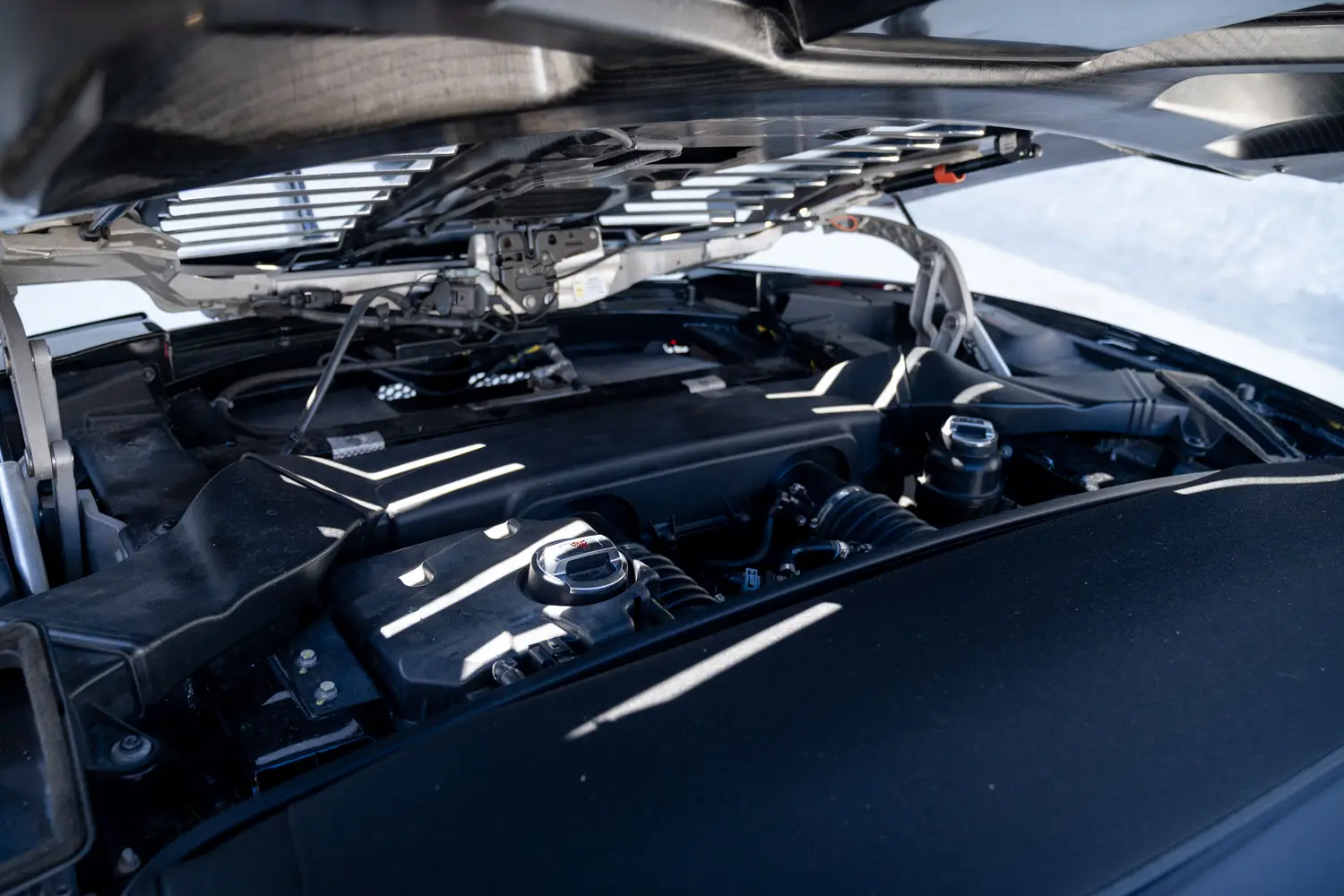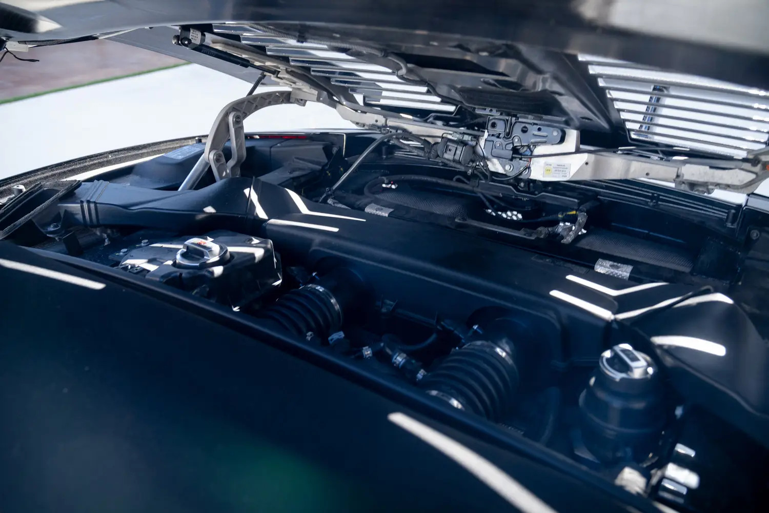 Both driver and passenger may manage their own comfort with the dual zone climate control system for air conditioning, fan level and heated seat settings. On top of the dash, three analog dials monitor oil pressure, oil temperature and battery output. There is even a small stash box built into the dash just to the left of the steering column where the driver may stow away valuables. It’s all so civilized that it belies the growling 552- horse V10 engine that sits under the rear bonnet which, oh by the way, is illuminated with an LED lighting system so it’s visible under the tempered glass in the dark.