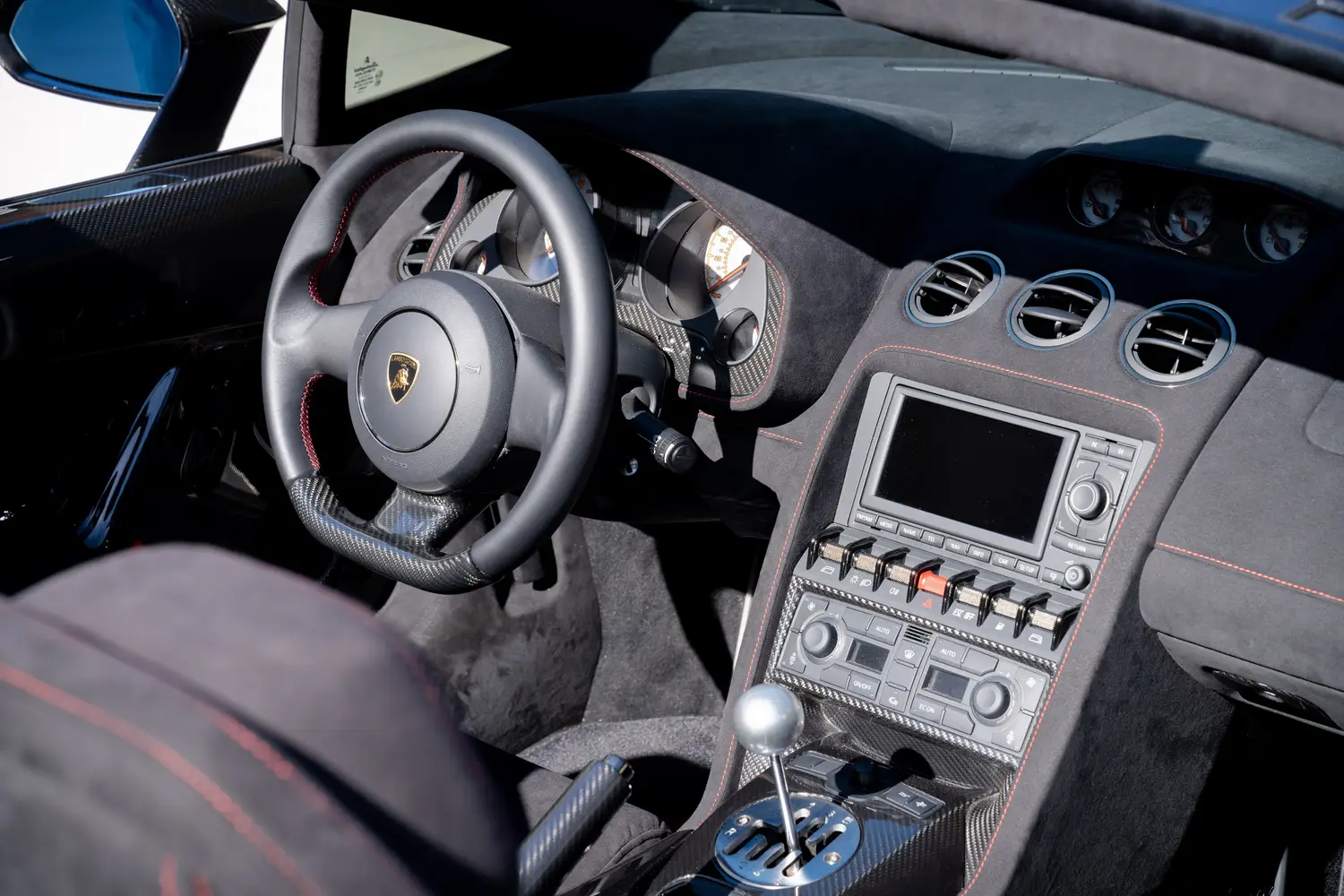 With nearly 40BHP more than the previous Gallardo, Lamborghini offered the LP560-4 with the choice of E-Gear transmission or a standard manual 6-speed mated with the all-wheel drive system, what Lamborghini calls the “Viscous Traction System,” contacting the ground with 19” aluminum wheels shod with Pirelli P-Zero 295/30 ZR 19 tires in the rear and 235/35 ZR 19 in the front. In all, with weight reduction and increased power from the engine, performance increased as the car launches from 0-60MPH in 3.7 seconds and 0-120MPH in 11.8 seconds and a top speed of 202MPH.