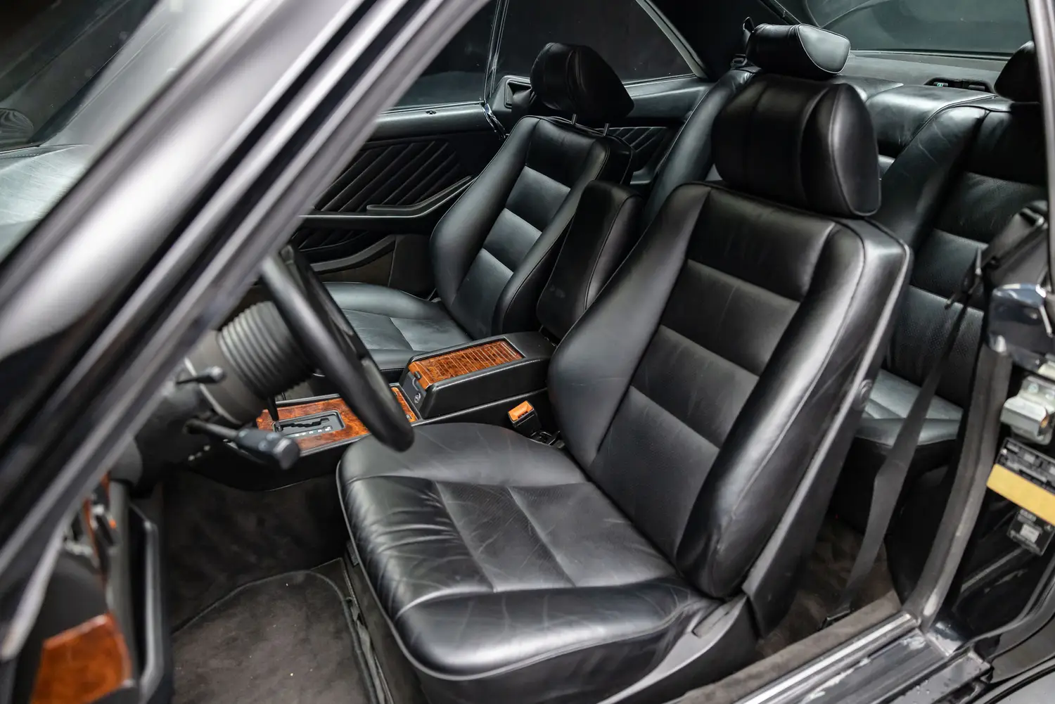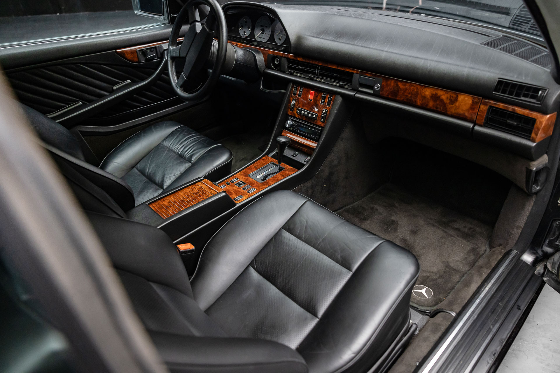 What really set the AMG-tuned 560 SEC apart visually, though, was the widebody kit. The car’s widened fenders and muscular stance weren’t just for show. These modifications accommodated larger wheels and tires for better grip, giving the 560 SEC a road presence that was as intimidating as it was beautiful. AMG’s signature widebody look was all about combining aesthetics with performance—those flared arches were designed for more than just style; they improved the car’s handling and grip, allowing this grand tourer to corner with precision despite its size.