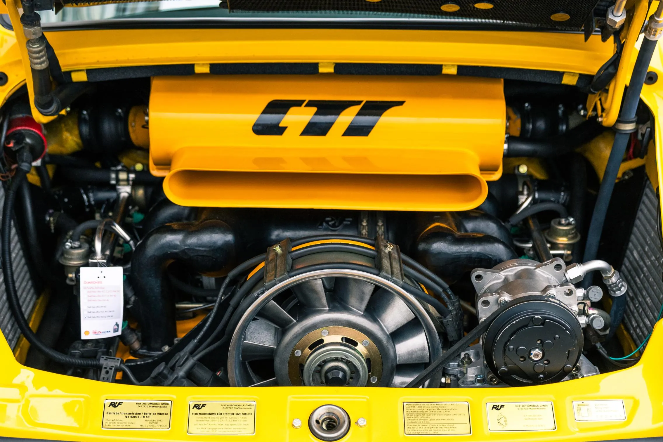 The car’s performance stemmed from an extensively modified 3.2-liter air-cooled flat-six engine. RUF enhanced the engine by enlarging the intake system, adding twin turbochargers, a Bosch fuel injection system, and custom-built intercoolers. These upgrades produced a guaranteed minimum output of 469 PS, with peak figures reaching up to 510 BHP in ideal conditions.