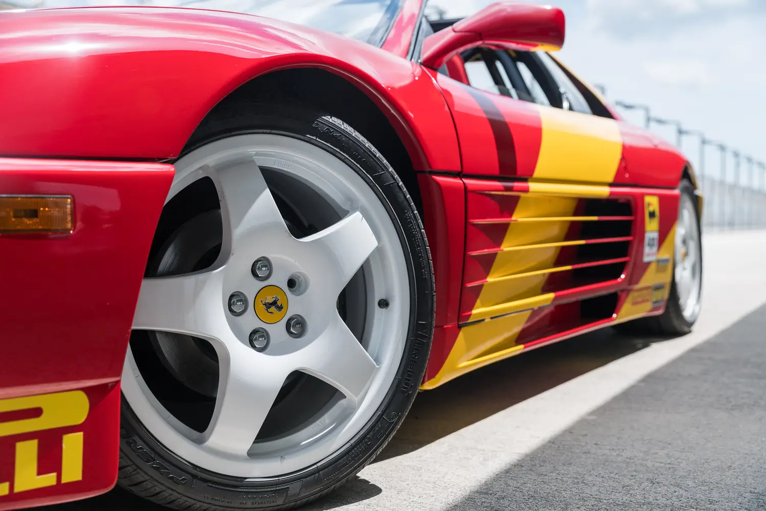 The wheels which were received with the car are likewise matching red and yellow but on seeing the images of noted Ferrari Challenge Series photographer Bruce Miller whom provided three dozen pictures of the car from period, the original Speedline wheels were white so the wheels will go back to white.