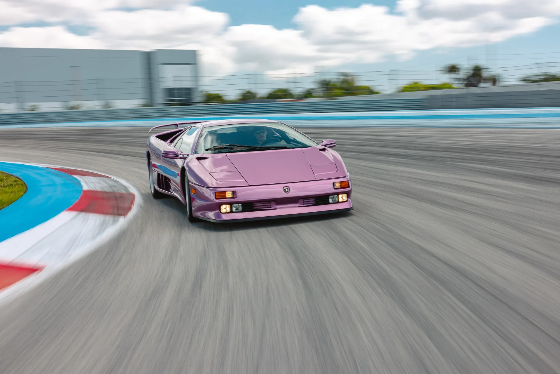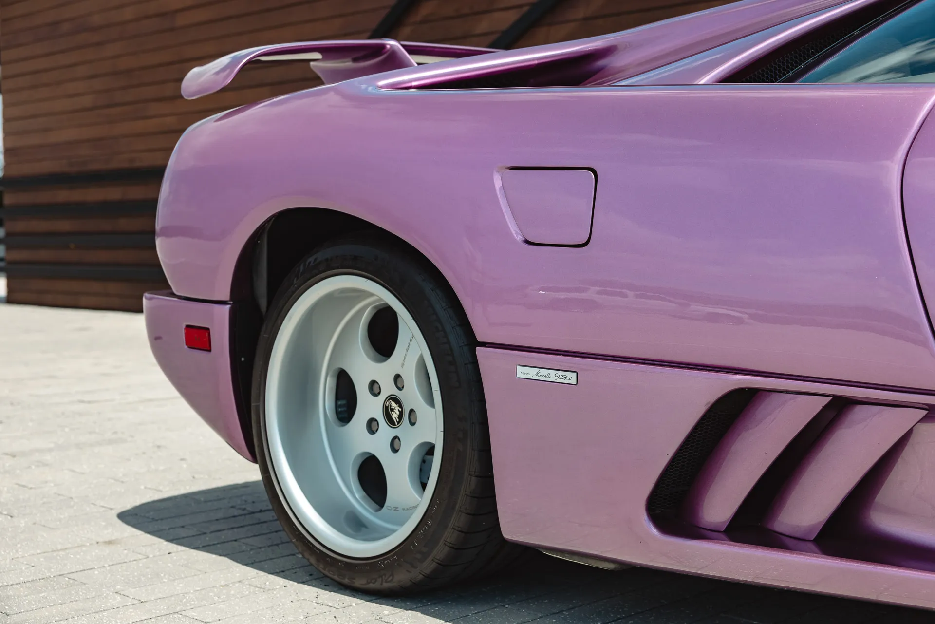 Under its rear clamshell is a 5.7-liter, 48-valve V12 producing 525 horsepower at 7,100 rpm, feeding the rear wheels through a five-speed manual gearbox with a limited-slip differential. With a curb weight approximately 125 kg lighter than the standard Diablo thanks to thinner glass, carbon fiber panels, and minimal sound insulation, the SE30 was the most focused, track-ready Diablo of its era.