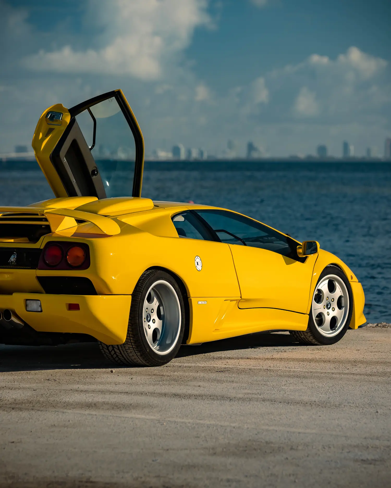 Under the hood, the JOTA modification extracts nearly 600 BHP from its naturally-aspirated V12, 4-valve engine. The car also features fixed suspension, adjustable sway bars, and lightweight plexiglass windows instead of standard glass, all contributing to its track-focused design and performance. Priced at $300,000 when new, the JOTA represents a significant evolution from the standard Diablo SE30, focusing on enhanced speed, handling, and distinctive racing features.