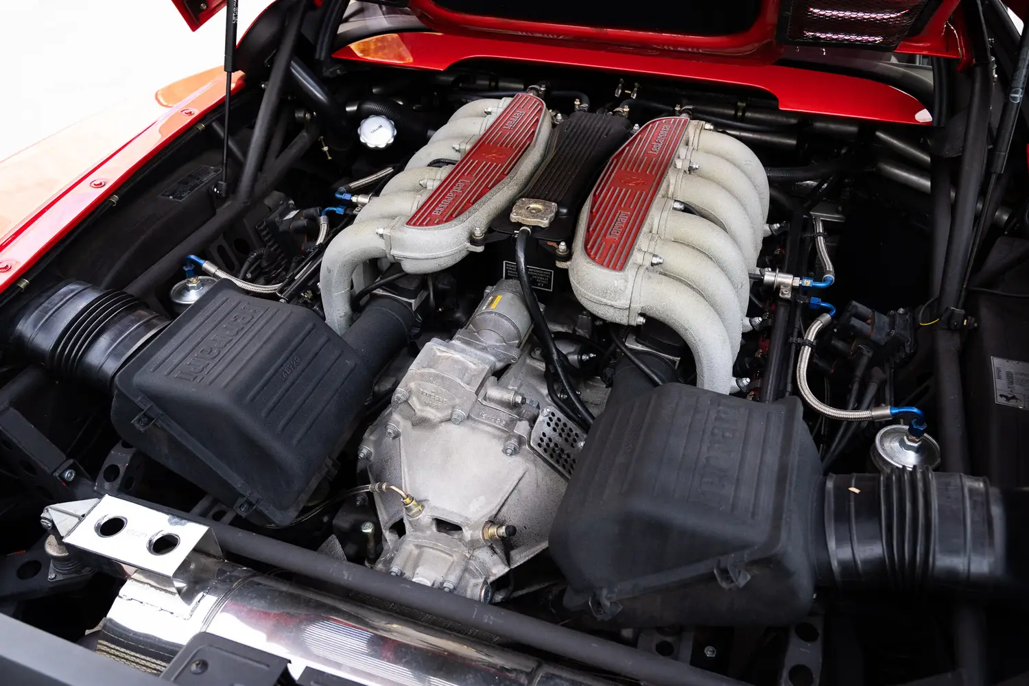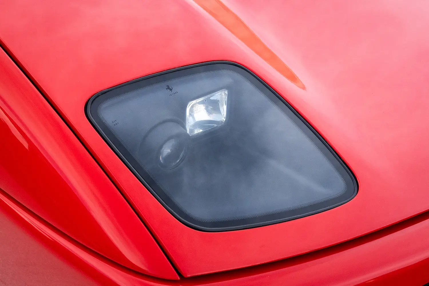 As soon as we first glanced at Chassis Ferrari 512M we realized how special this car was. Every surface of the interior, still had its factory matte sheen, the seats still with perfect supple contours, the carpets were covered in plastic protective film, the Rosso Corsa paint original and never “detailed” or polished. All of the switches, gauges, original radio, looked as they would in 1995. Upon opening the engine bonnet we could see the car was incredibly well preserved in a climate controlled garage and meticulously maintained. All perfect zinc coatings on the original hood latches and bolts and factory stickers affixed perfect to the under bonnets.