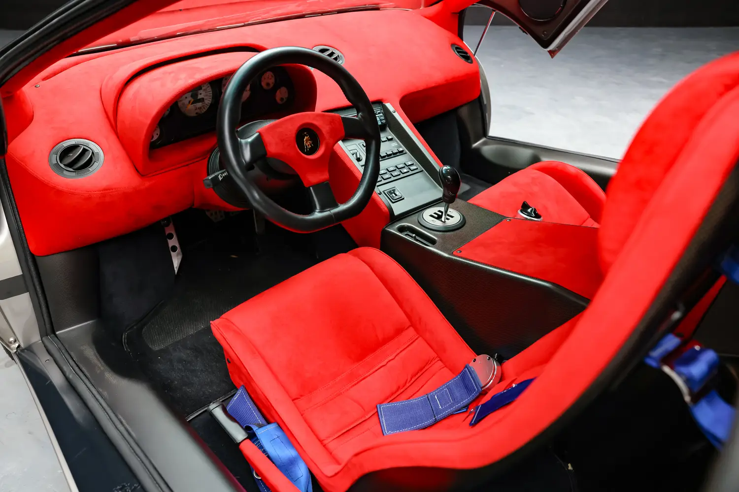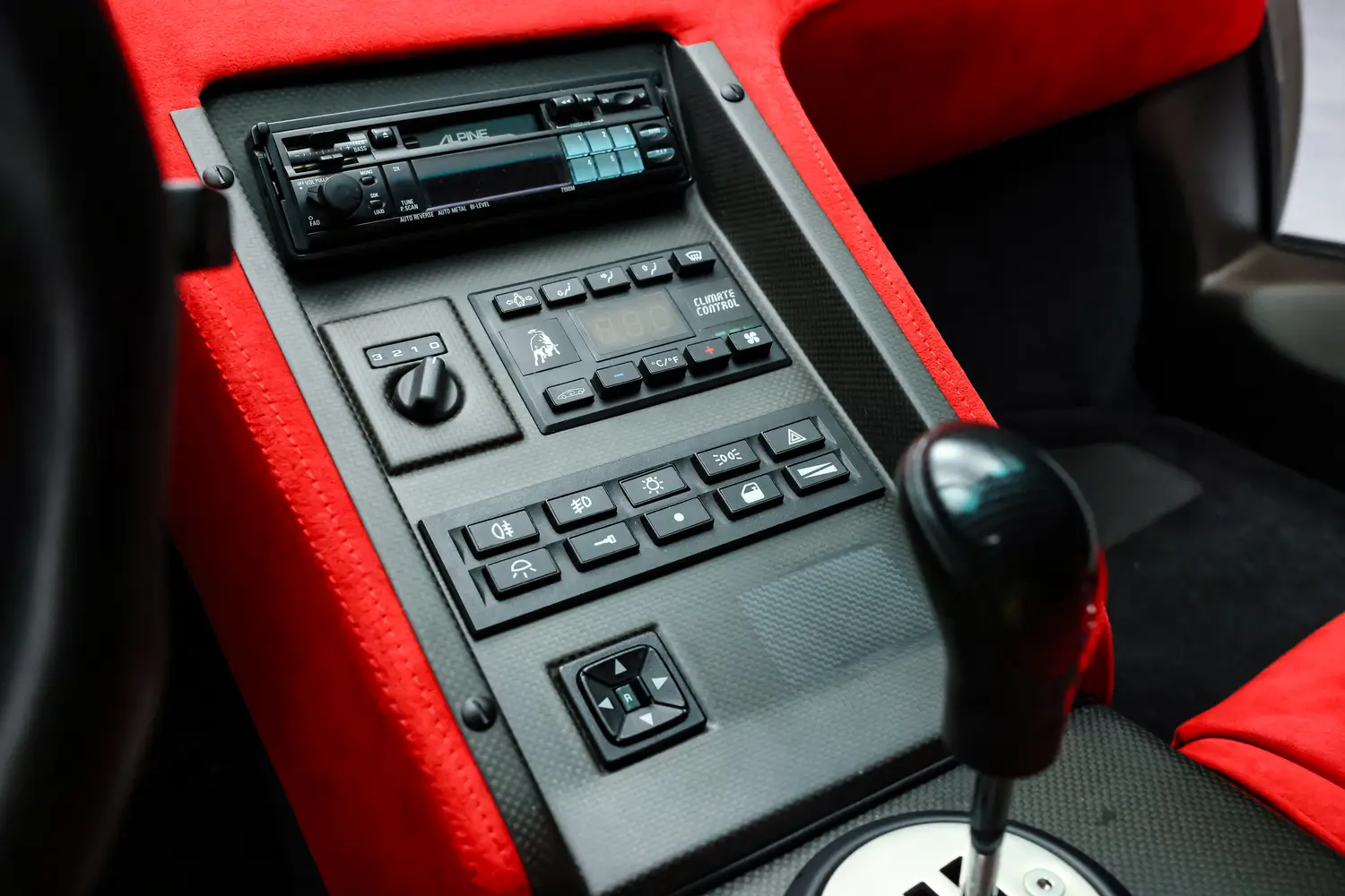 Chassis #2049 is a European-spec SE30 finished in Argento over Red Alcantara—a one-of-one configuration. It has received a concours-level restoration and remains a standout example of Lamborghini’s transitional supercar era.