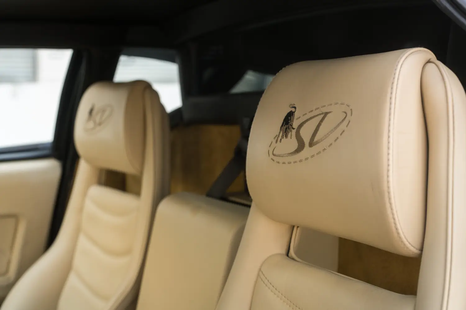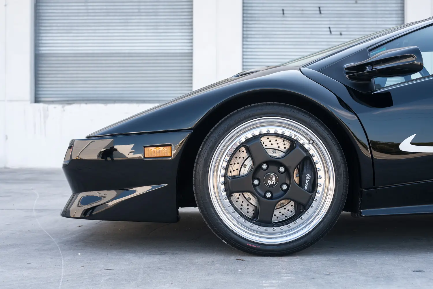 An adjustable rear spoiler was installed as standard equipment and could be color-matched to the car body or formed from carbon fiber. Other exterior changes included black tail lamp surrounds, repositioned rear fog and reverse lamps as on the SE30, dual front foglamps (rather than the quad style found on all previous models), an extra set of front brake cooling ducts, a ducted engine lid similar to that installed on the Diablo SE30 Jota, and optional “SV” decals for the sides of the car. The SV also featured larger diameter front brakes (13.4”) and a corresponding increase in front wheel size to 18”.