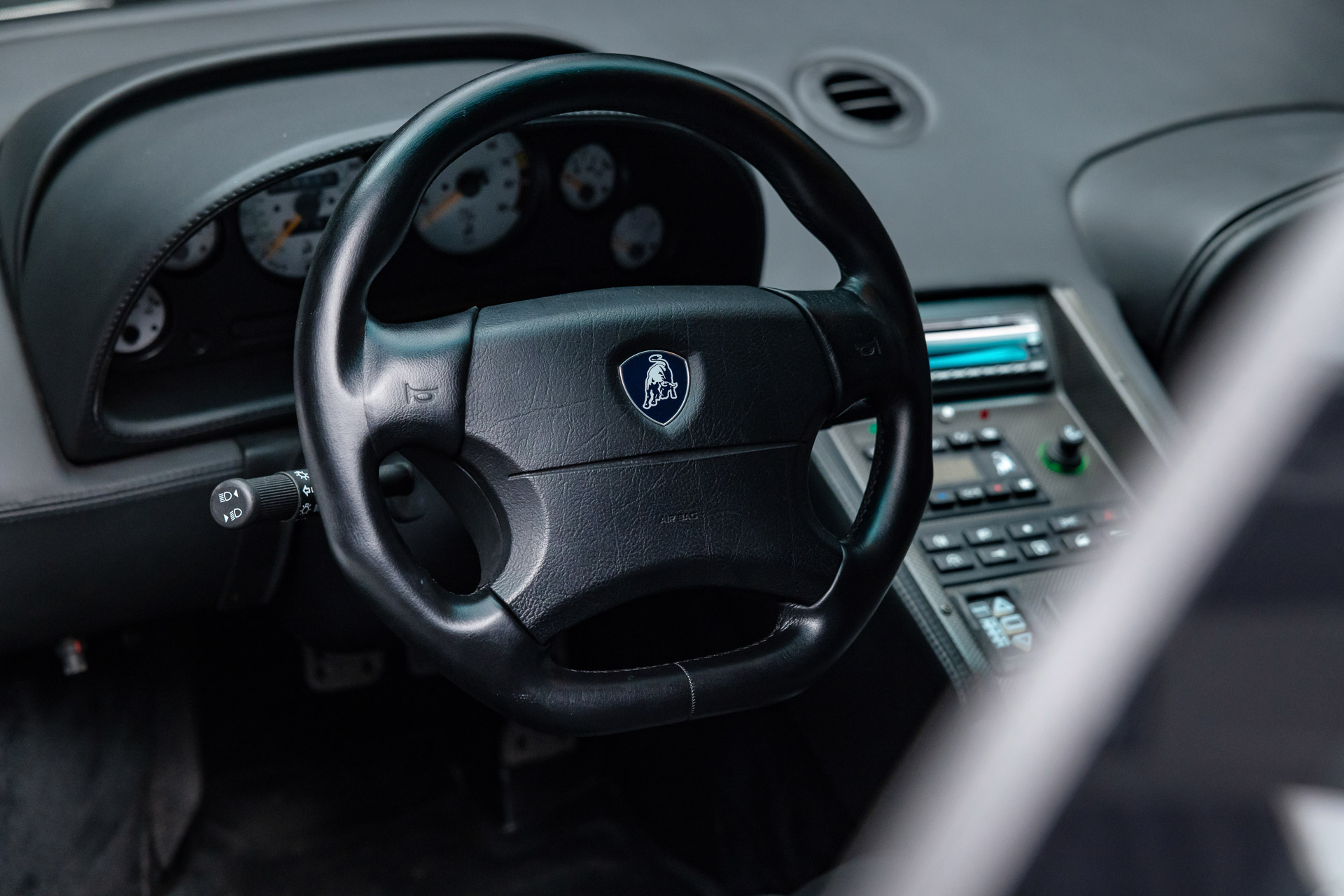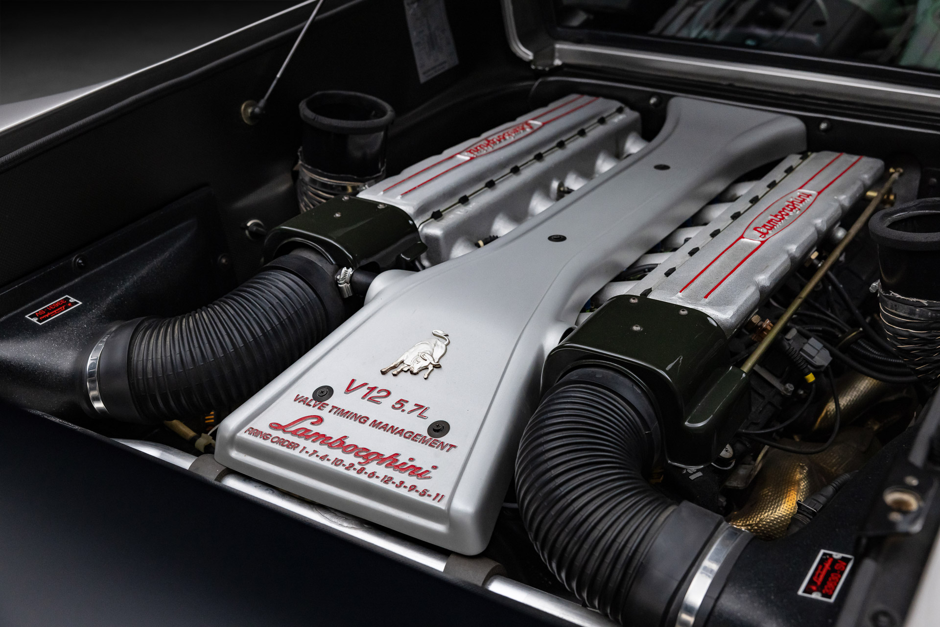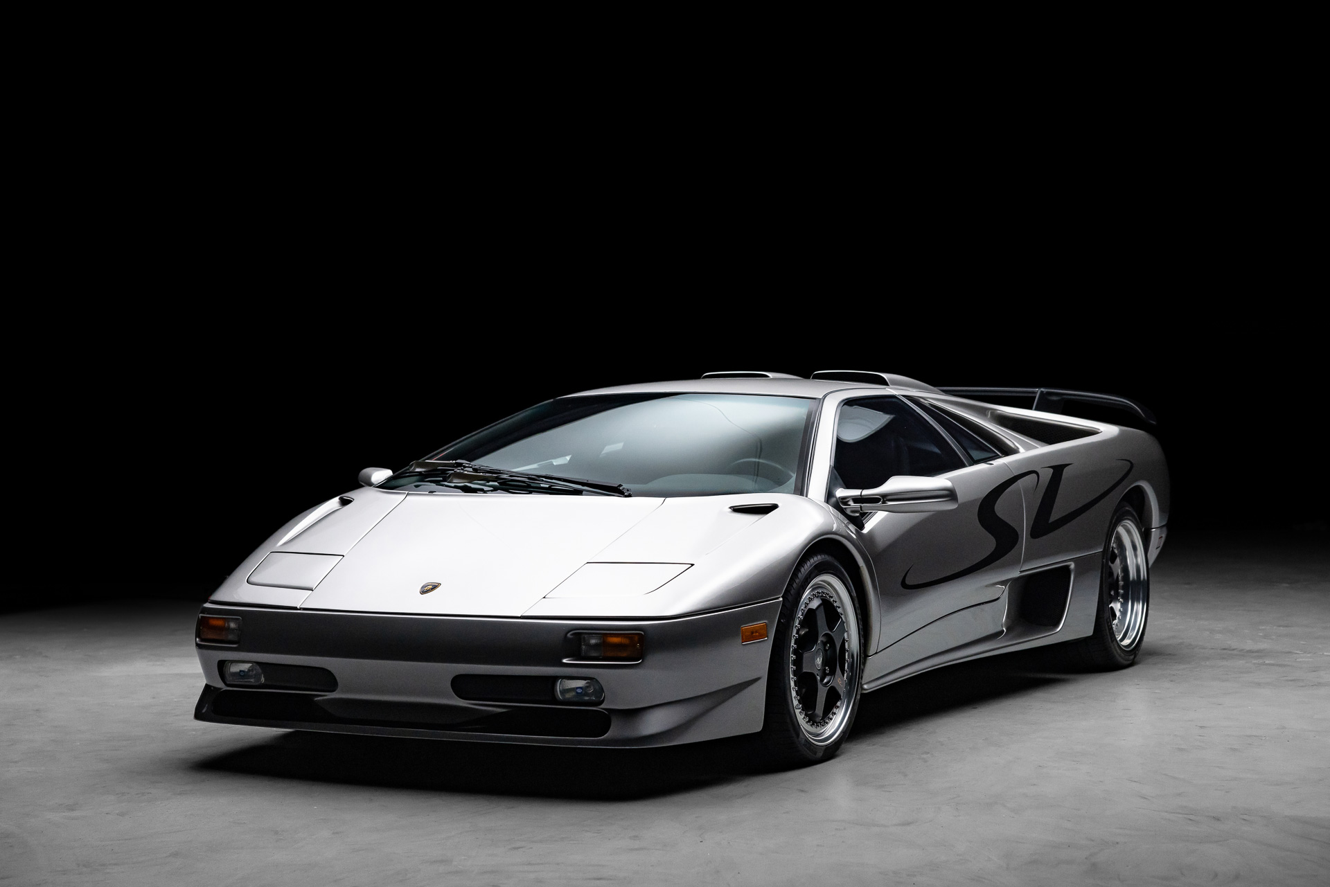 This 1998 Lamborghini Diablo SV, chassis number 12951, is finished in rare Argento Titanio (Titanium Silver) over a black leather interior. It is one of just 89 Diablo SV examples delivered to the U.S. market, making it exceptionally rare. The car is equipped with a 5-speed manual transmission, the iconic carbon fiber rear wing, factory Diablo SV wheels, and a front suspension lift system. The interior features carbon fiber trim and door sills, along with an upgraded Alpine stereo system. The original SV graphics on the sides complete the car’s striking appearance. This Diablo SV is in stunning concours condition, with only 5,663 km.