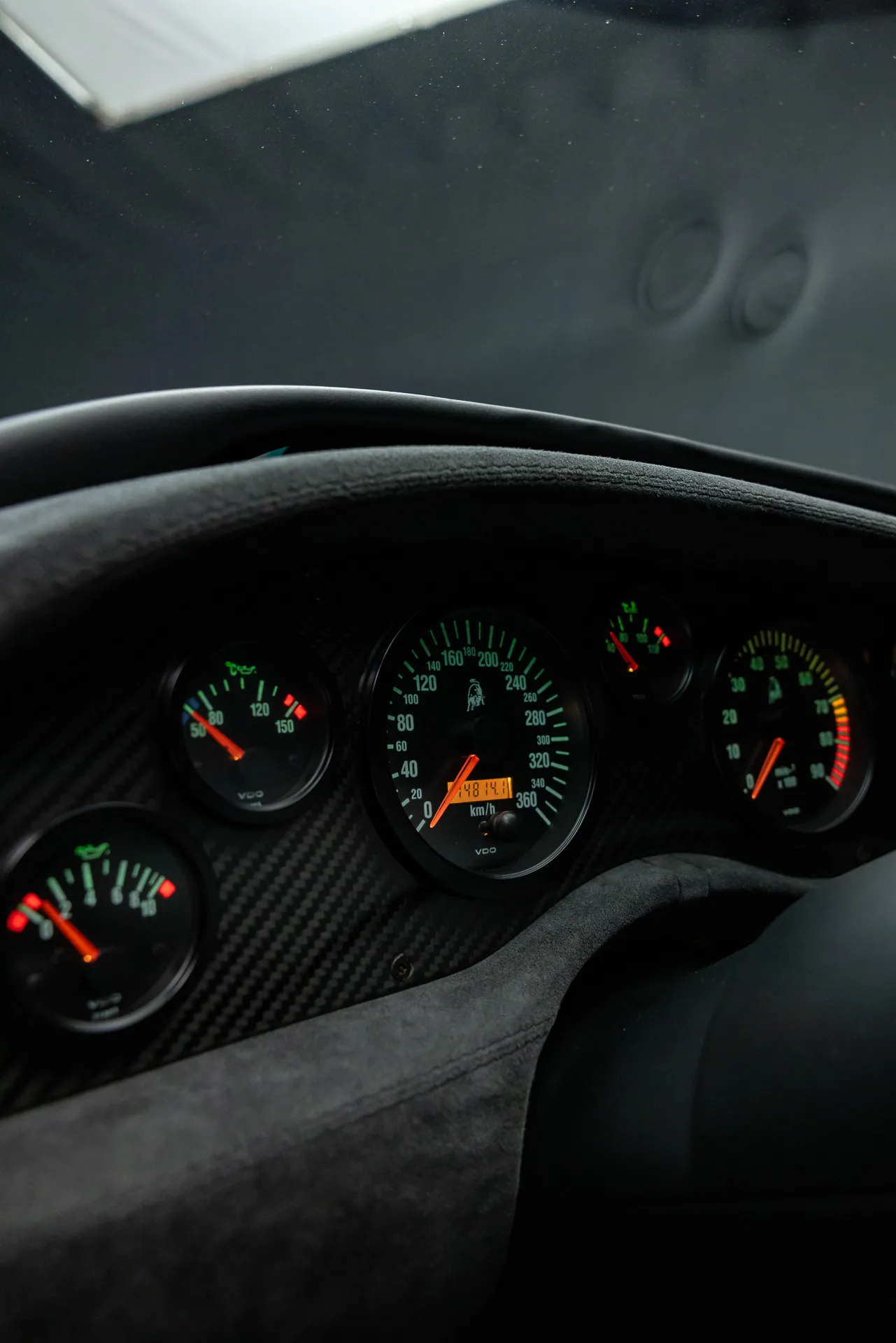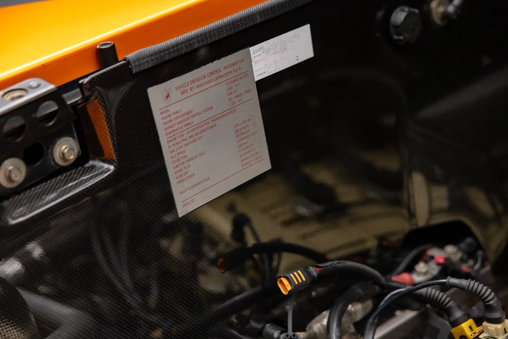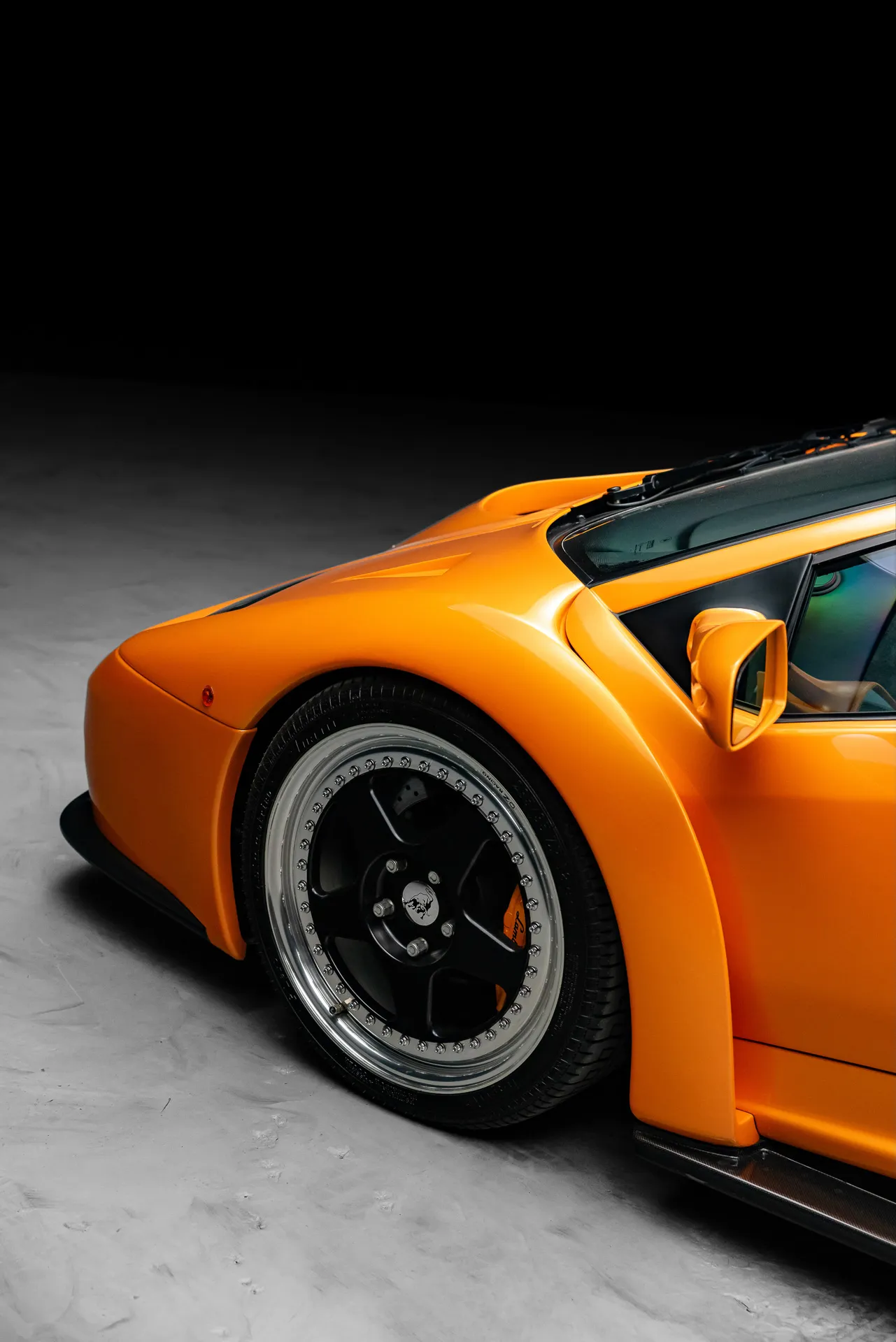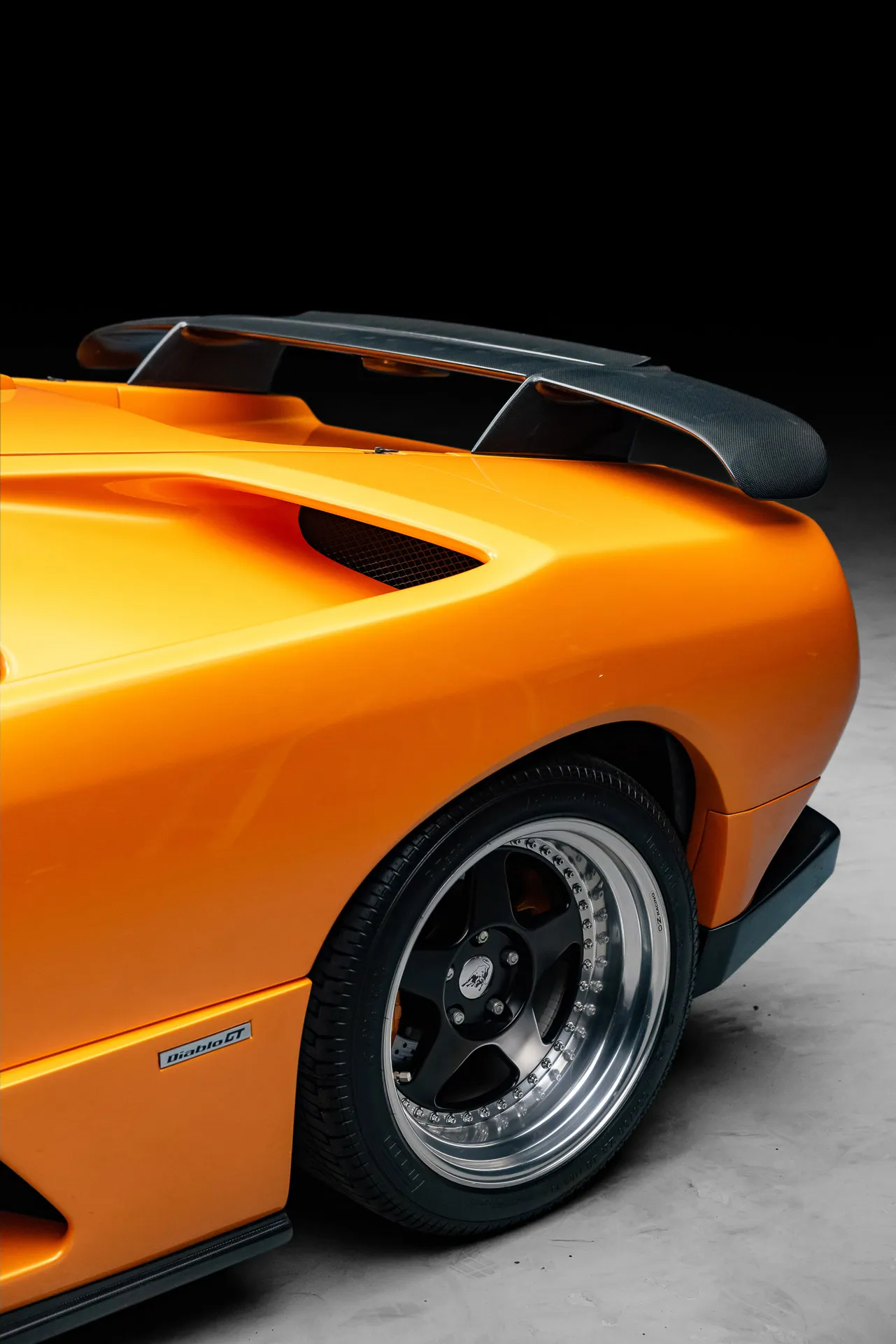 The bodywork of the Diablo GT is where the car truly distinguishes itself from other Diablos. Carbon fiber was used extensively throughout the body, including the front air dam, rear diffuser, and a central vent on the hood to aid cooling. A prominent ram air intake on the rear engine bonnet and a large carbon fiber rear wing enhance the car’s aggressive stance and aerodynamic performance. The car rides on specially designed three-piece O.Z. Racing wheels, further adding to its racing pedigree.