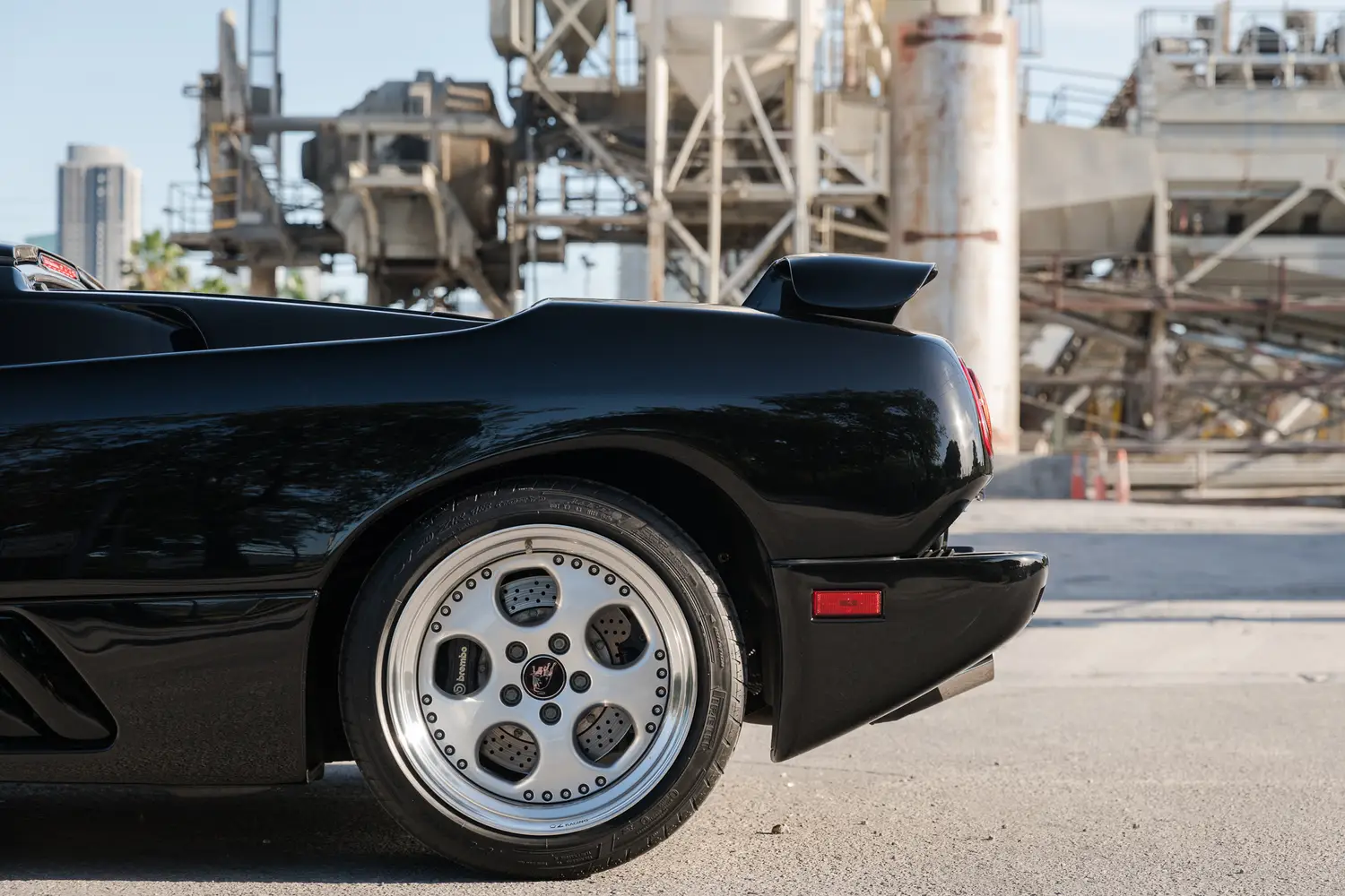 The Roadster, the first widely produced convertible by Lamborghini, originally appeared at the Bologna Auto Show in December of 1995 in much the same guise as the 6.0 liter VT with minor cosmetic changes, notably the revised front bumper and head lamp arrangement which featured two rectangular and two round lights. The front brake cooling ducts moved inboard of the driving lamps where the rear ducts featured a vertical painted design as seen on the SE30.