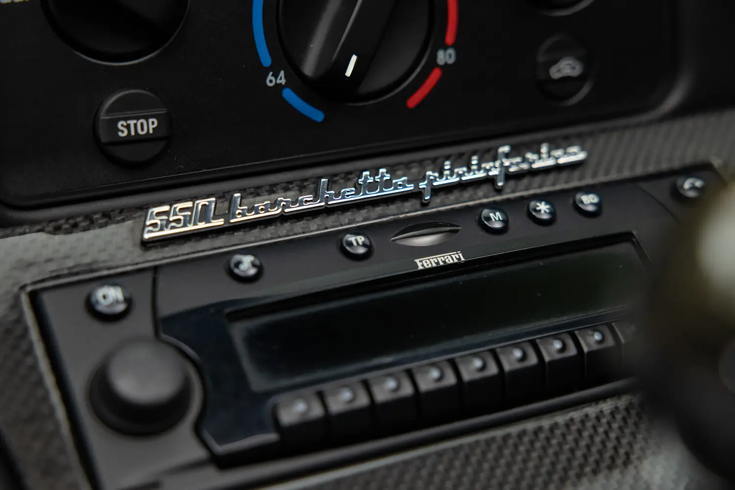 The 550 Barchetta debuted at the 2000 Paris Auto Show, celebrating Pininfarina's 70th anniversary. This true roadster featured a snap-on cloth cover for the leather interior, considered temporary at speeds over 70 mph due to wind noise and buffeting. Pininfarina enhanced the Barchetta's aerodynamics with a raked windscreen and functional rollover hoops, creating a marginally longer and more functional car.