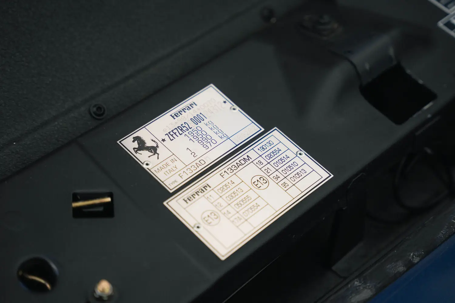 This example is accompanied by its original books, service invoices, and the factory-supplied bags containing two helmets. This car also has its Ferrari Classiche red book. It is equipped with a Tubi Style exhaust, though the original exhaust system is included.