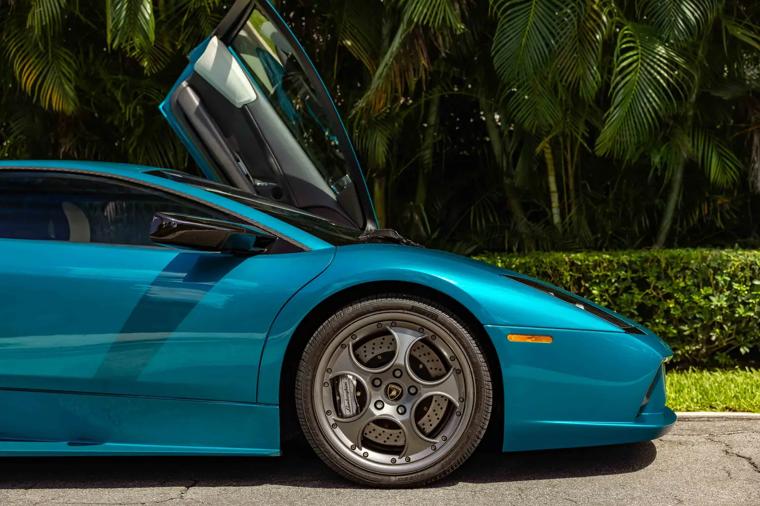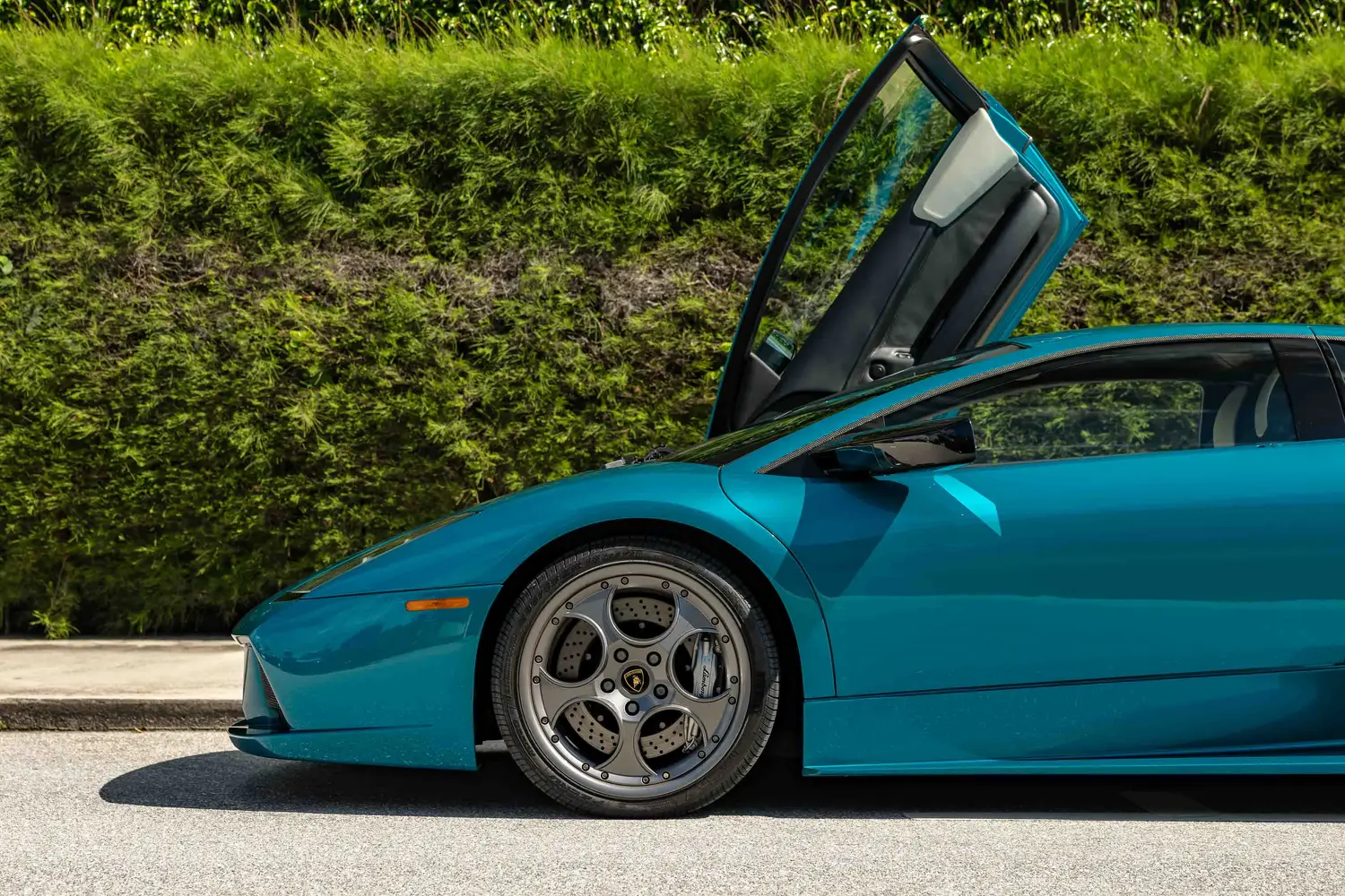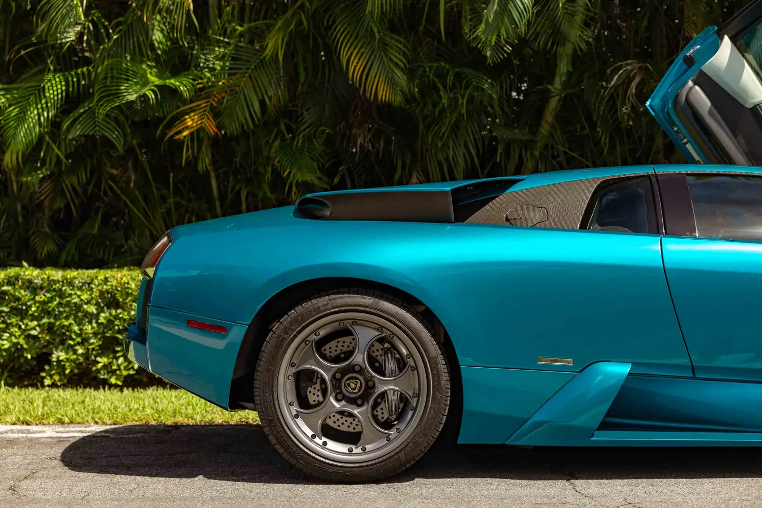 aluminum scissor doors, xenon headlights, a pantograph single wiper, carbon-fiber door and pillar trim, and rear intakes that deploy automatically when extra cooling is necessary.
