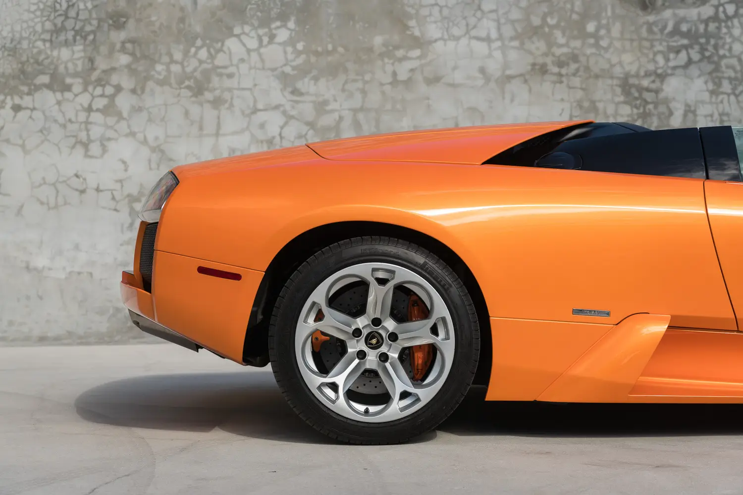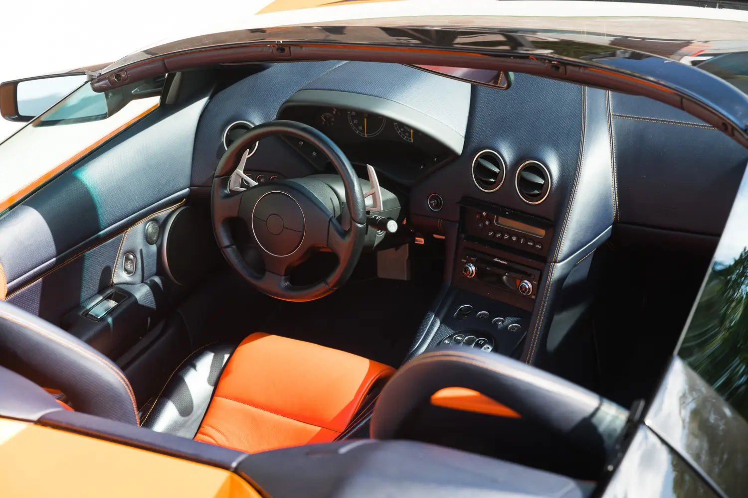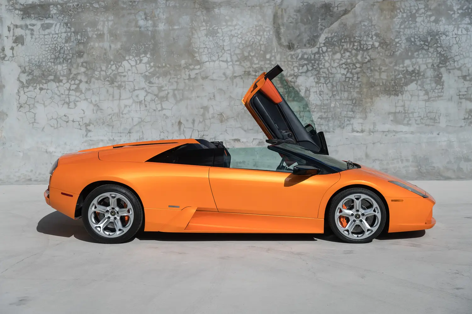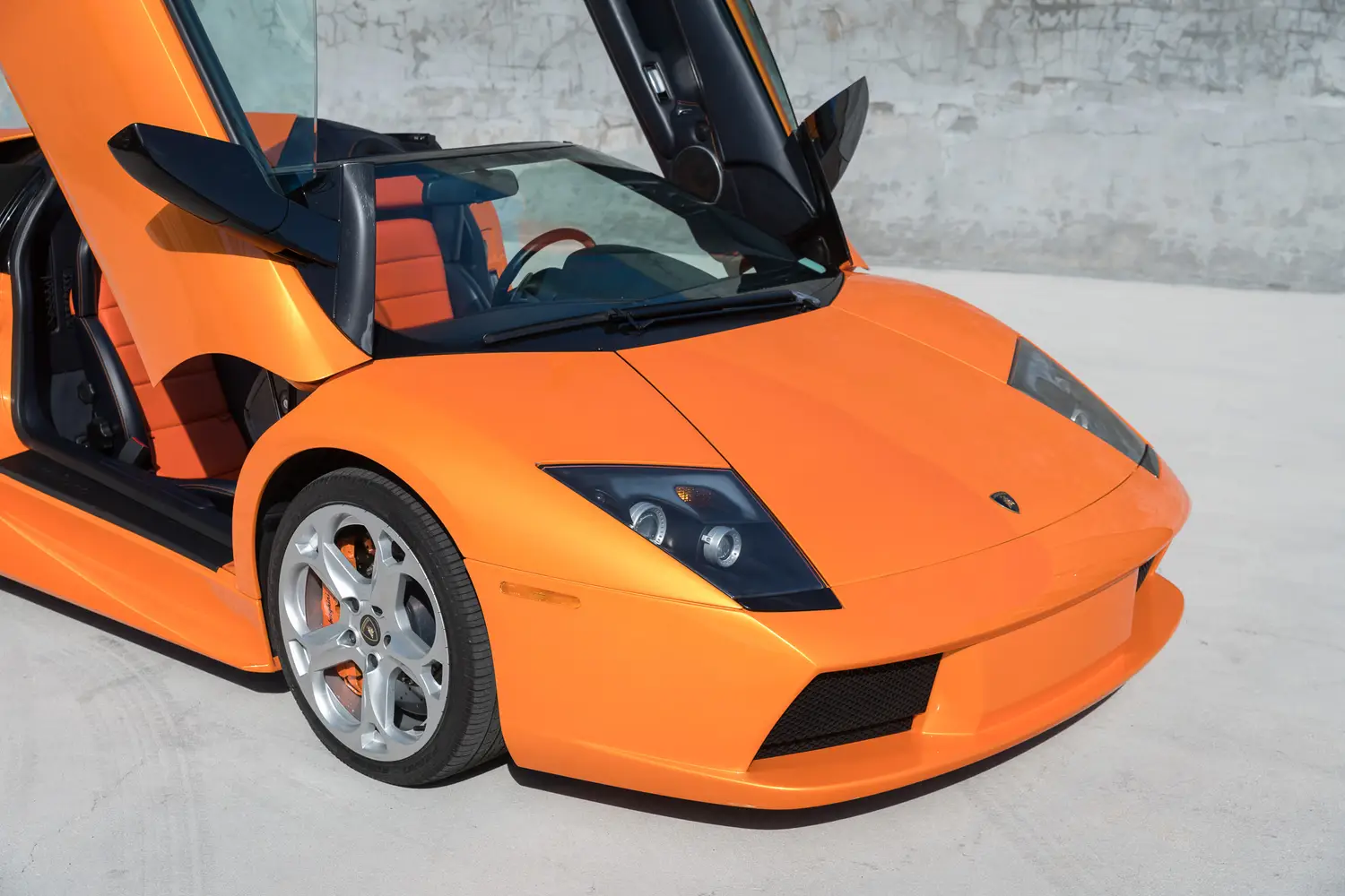 This Lamborghini Murciélago Roadster (#1673) comes in brilliant orange with black leather interior. The car has an E-Gear six-speed transmission, has had two owners from new, comes with full records and only 733 miles on the odometer.