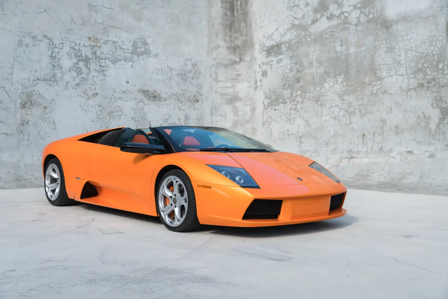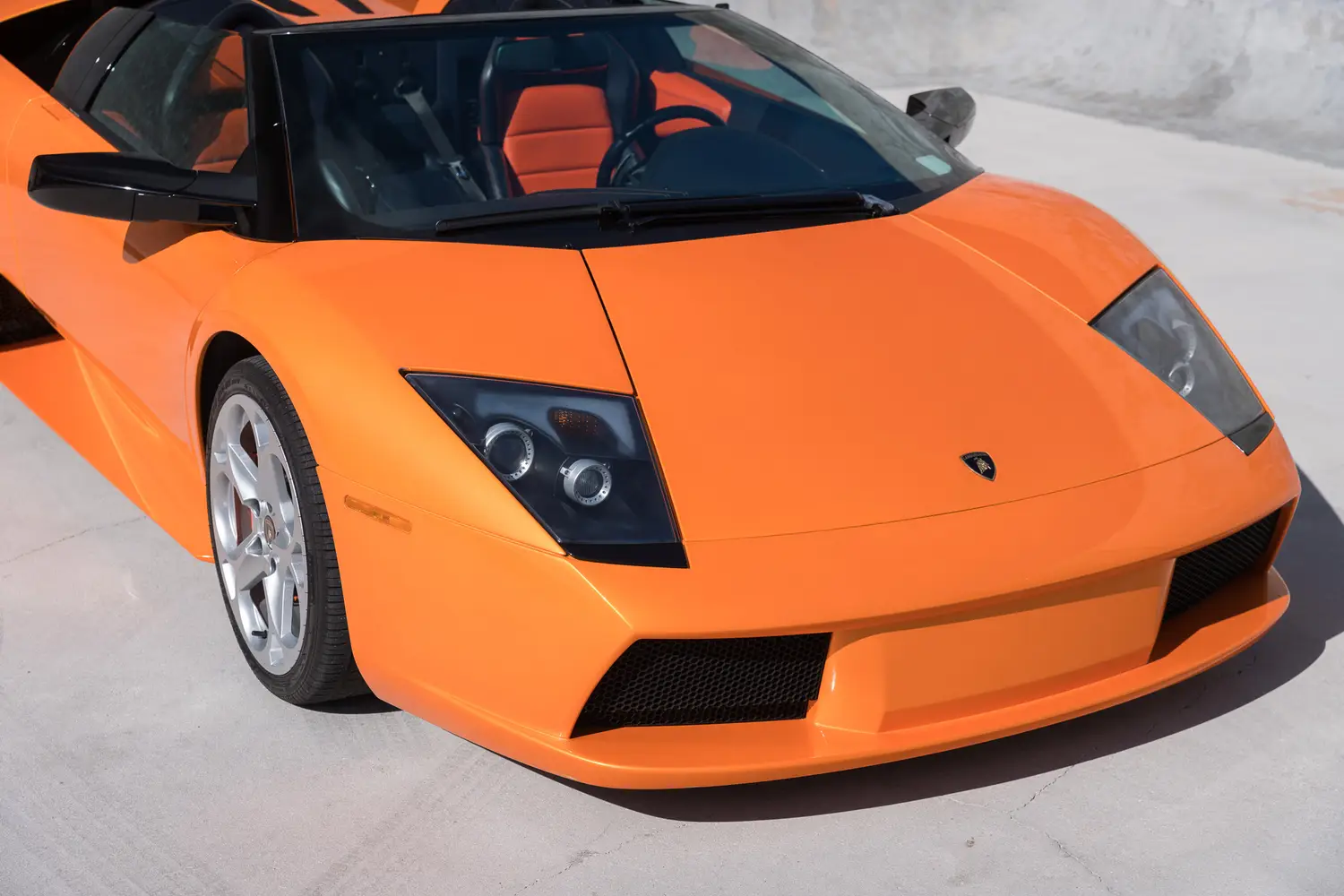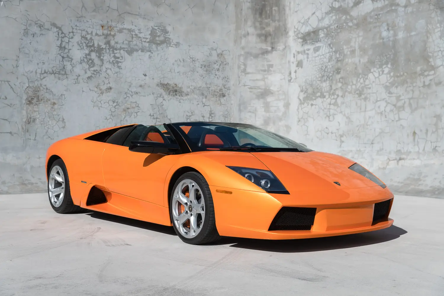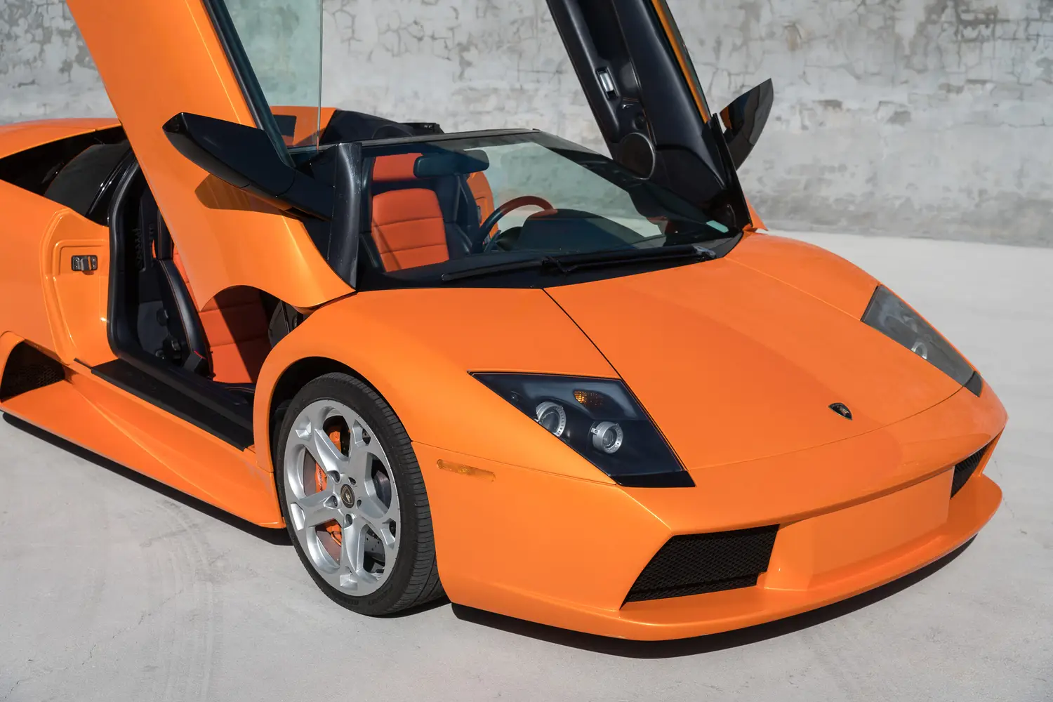 This Lamborghini Murciélago Roadster (#1673) comes in brilliant orange with black leather interior. The car has an E-Gear six-speed transmission, has had two owners from new, comes with full records and only 733 miles on the odometer.