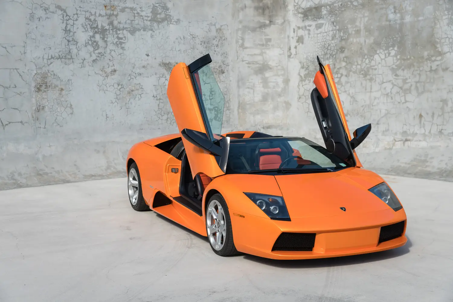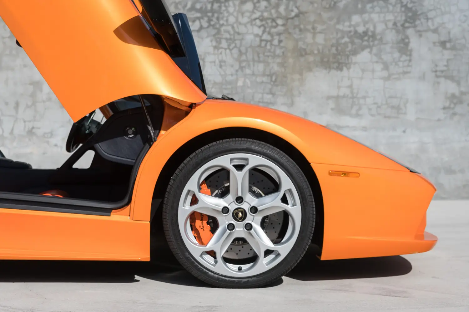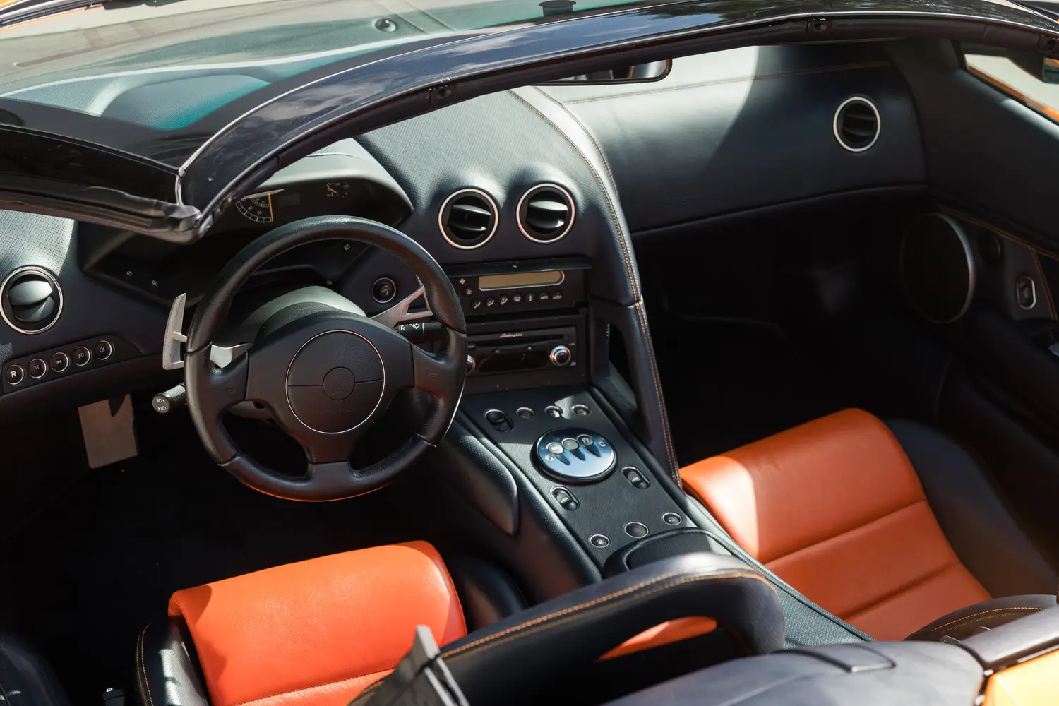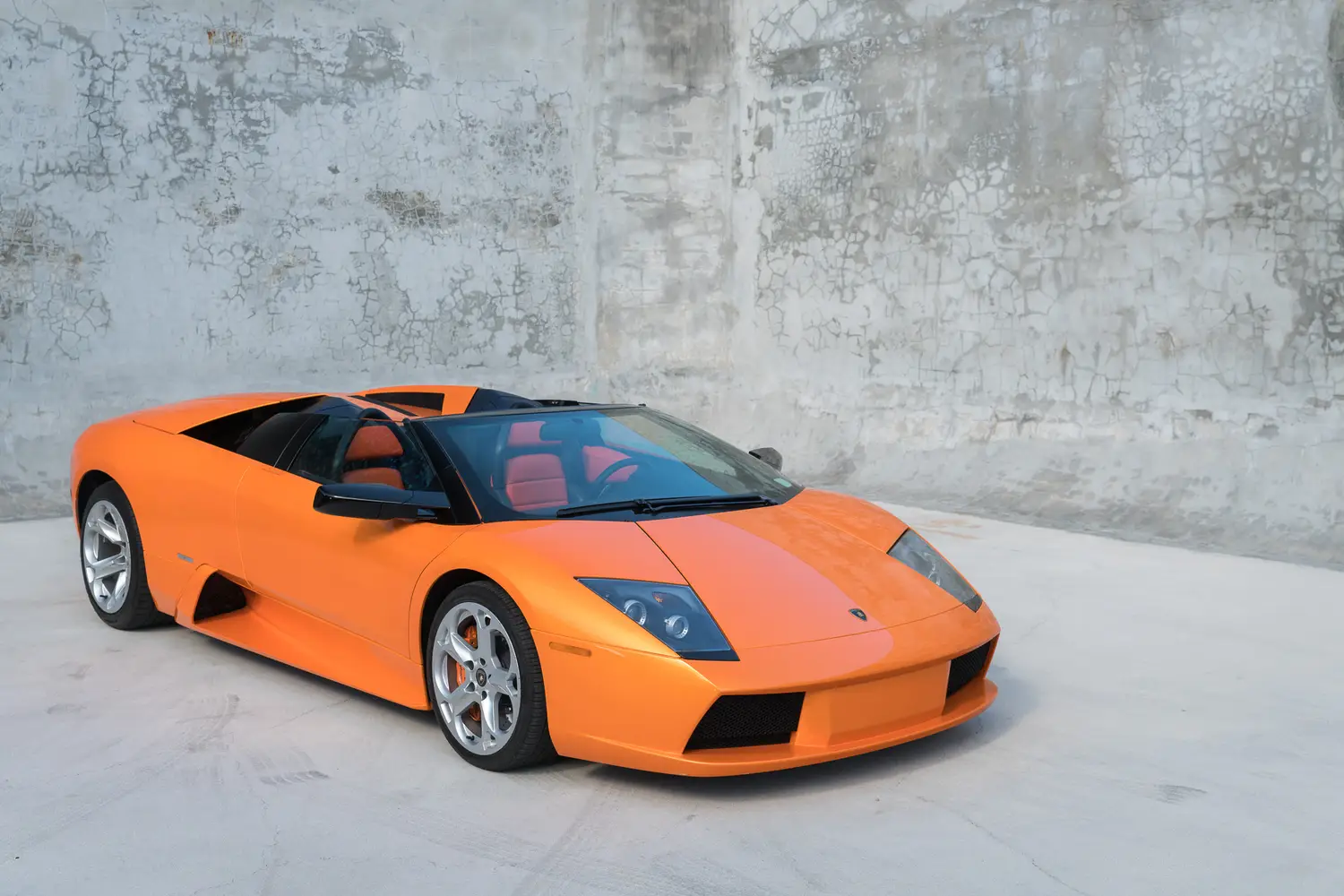 This Lamborghini Murciélago Roadster (#1673) comes in brilliant orange with black leather interior. The car has an E-Gear six-speed transmission, has had two owners from new, comes with full records and only 733 miles on the odometer.