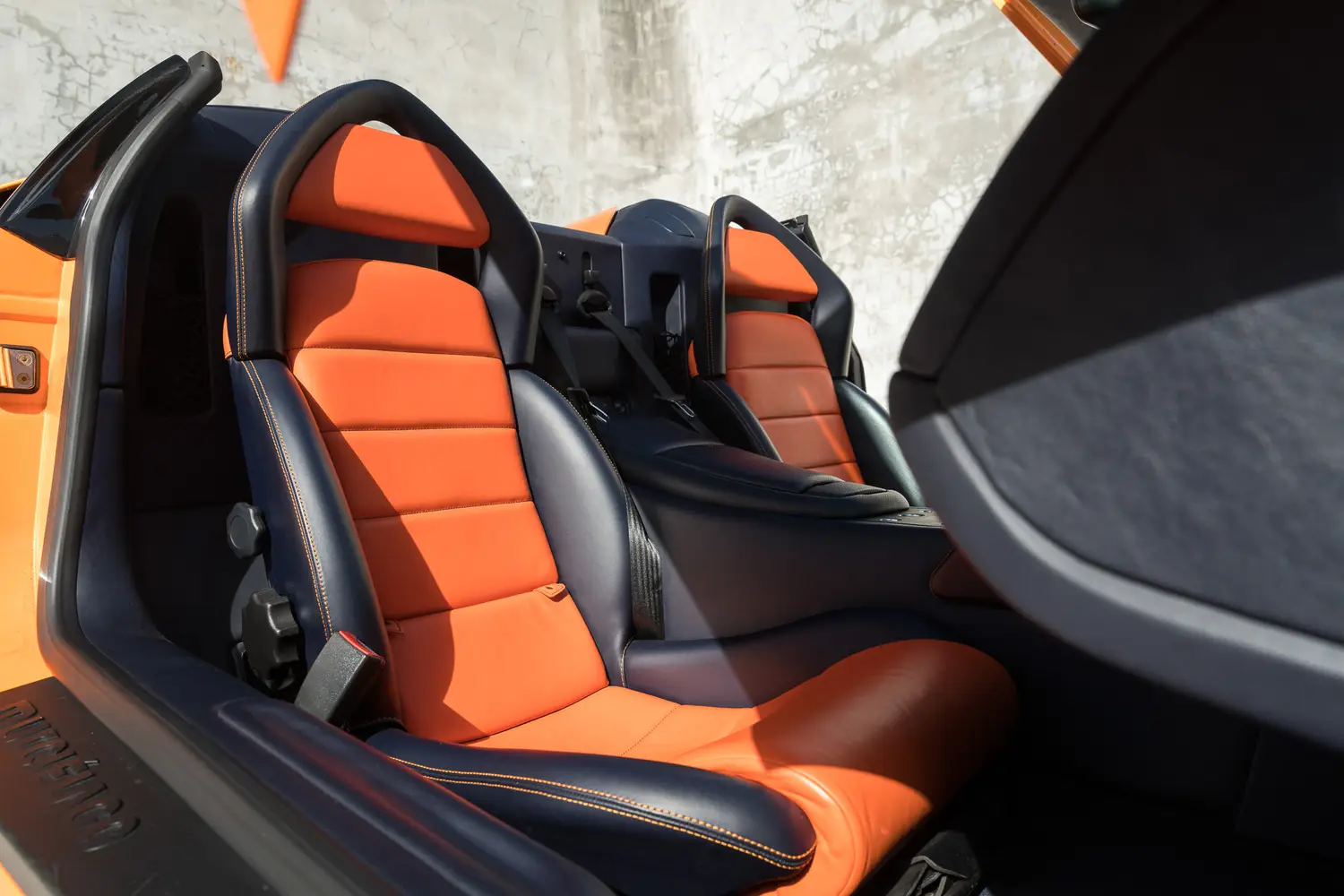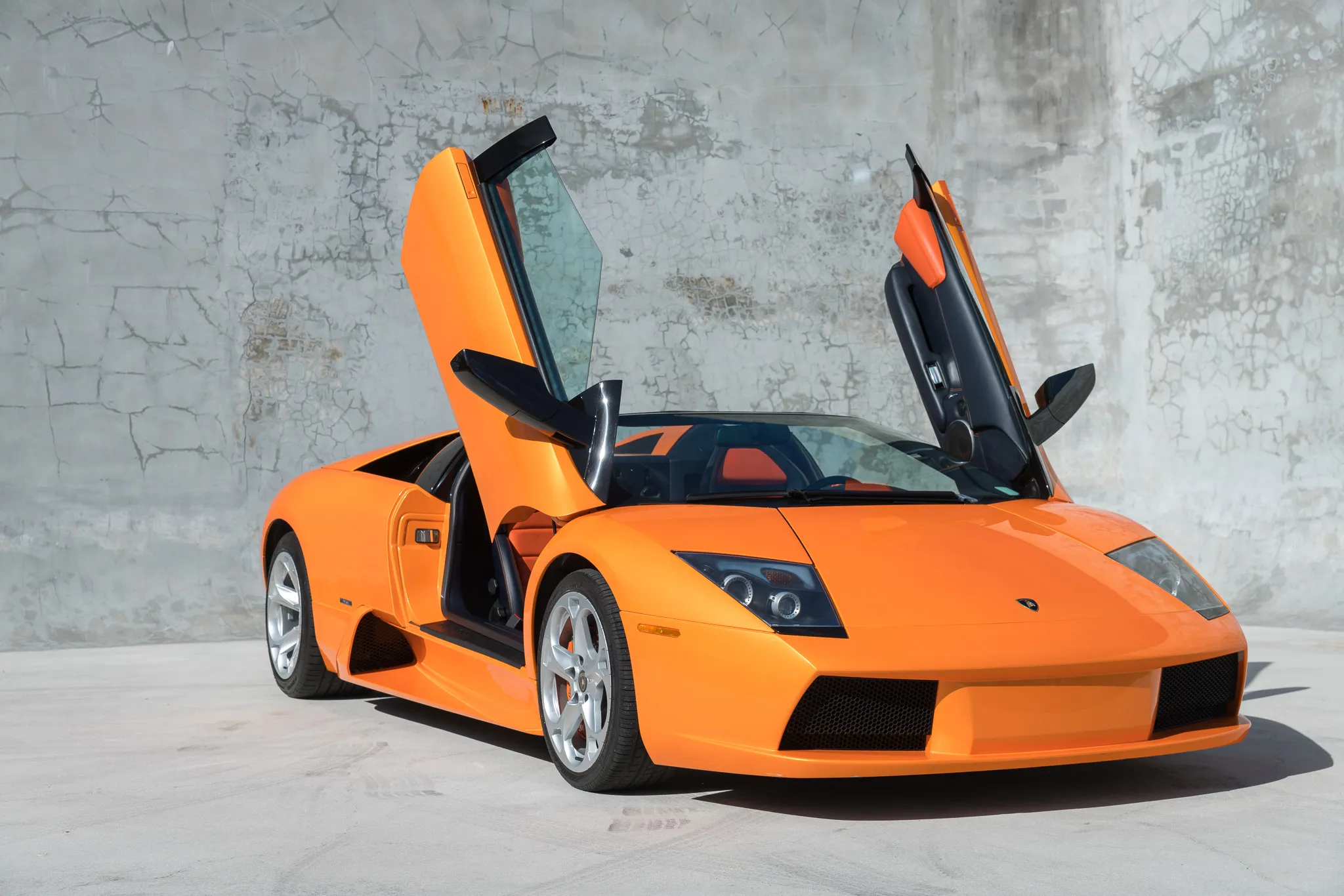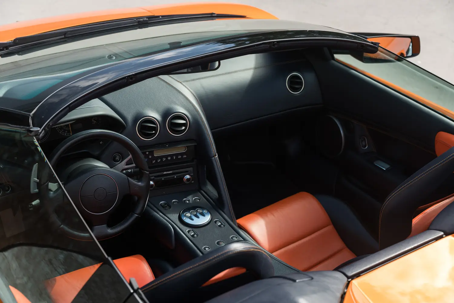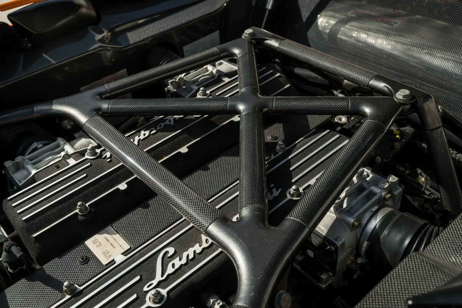This Lamborghini Murciélago Roadster (#1673) comes in brilliant orange with black leather interior. The car has an E-Gear six-speed transmission, has had two owners from new, comes with full records and only 733 miles on the odometer.